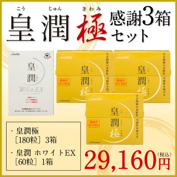 皇潤極(こうじゅんきわみ)感謝3箱セット+皇潤ホワイトEX1箱+あったか入浴剤付き!皇潤 ヒアルロン酸 コラーゲン サプリメント 皇潤 エバーライフ グルコサミン